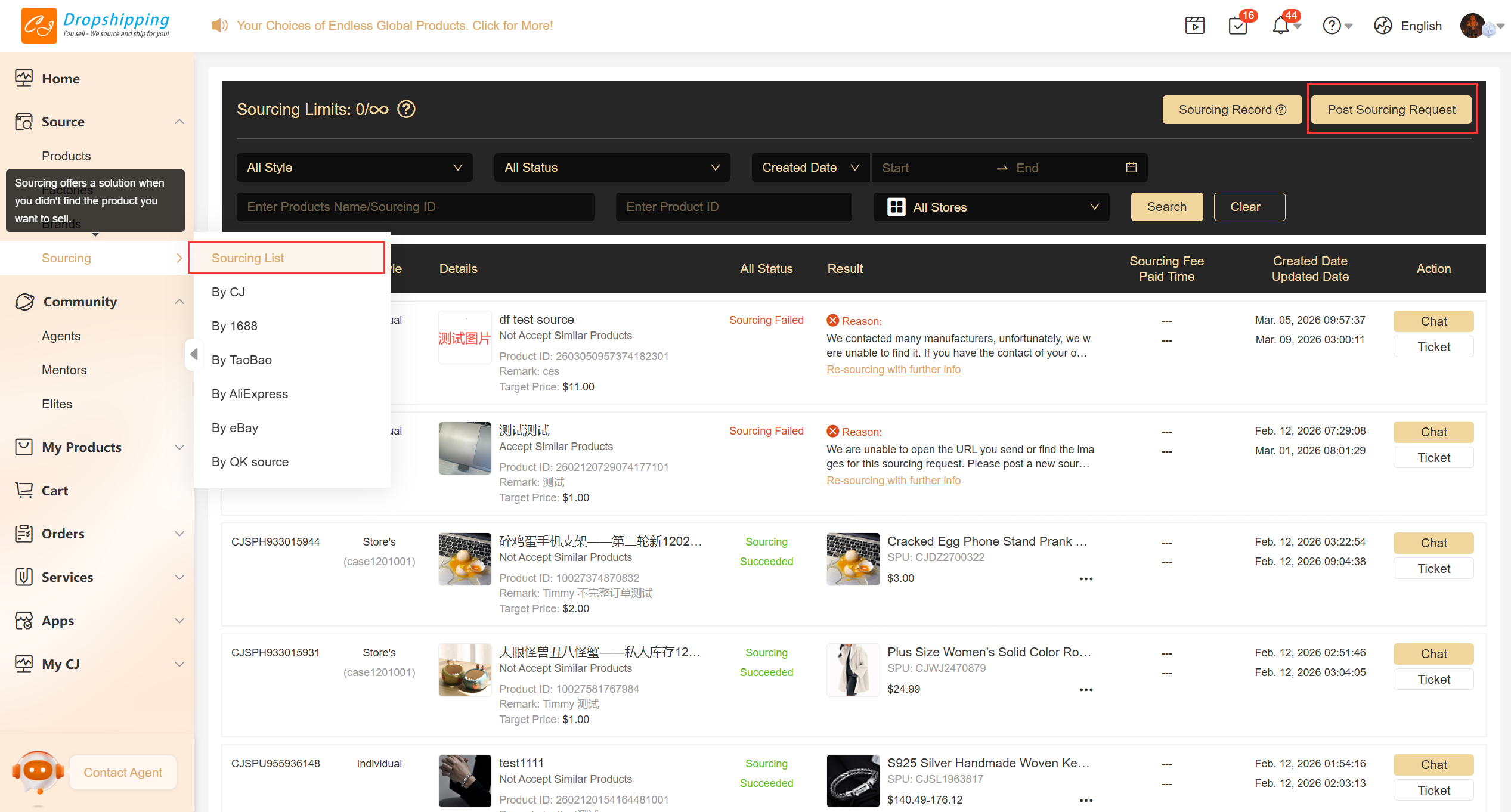 Here are the specific steps for posting sourcing requests from the CJ homepage or My CJ: