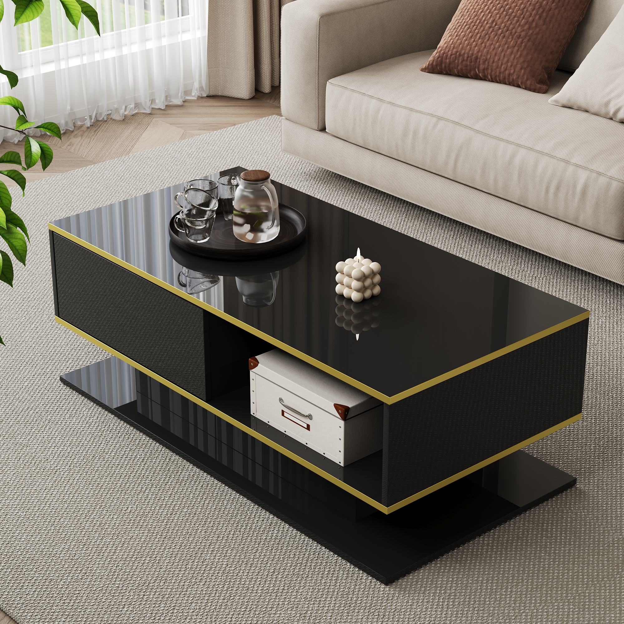 This modern coffee table has become the focal point of the living room with its unique design concept that perfectly combines practical functionality with artistic beauty. The spacious tabletop (100 × 50 × 40 cm) provides plenty of room for coffee essentials, decorations, or books and magazines. The high-gloss surface reflects attractive light and shadow effects, complemented by exquisite gold decorative lines that add a touch of luxury to any space. The specially designed LED ambient light strip allows for multi-color selection and stepless brightness adjustment. You can freely switch lighting effects according to your mood, creating a warm and romantic atmosphere or a modern, dynamic living environment. Three drawers and open compartments offer storage for remote controls, snacks, and small items, helping to keep the living room clean and organized. This coffee table combines aesthetics and functionality, adding the finishing touch to modern
