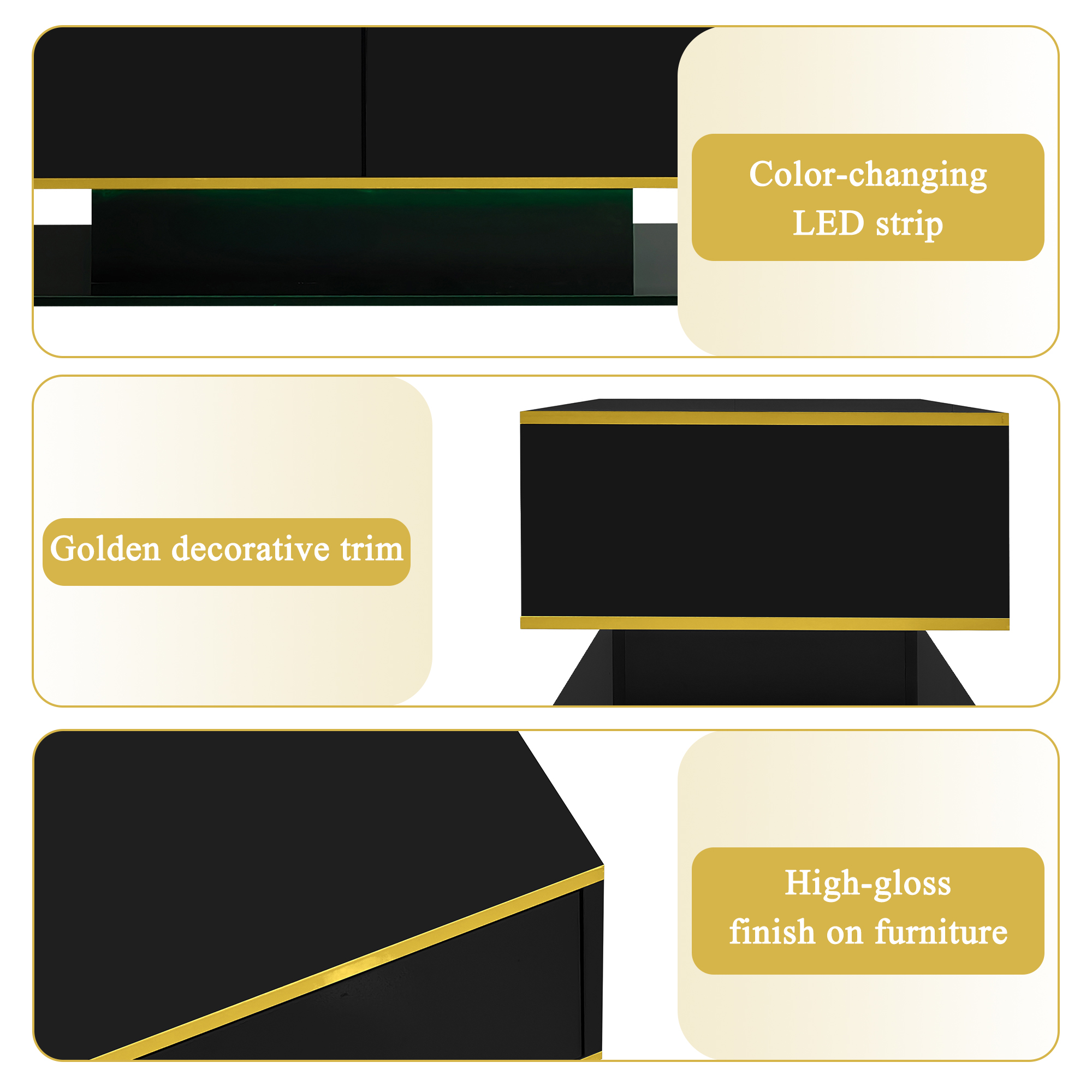 1.Golden decorative strips for a luxurious look 2.High-gloss surface that reflects the surroundings 3.Three drawers and one compartment for multifunctional storage 4.High-quality materials, durable and sturdy 5.Premium sliding rails for smooth operation 6.Color-changing LED light strips for flexible use 7.Ideal size, suitable for most living spaces